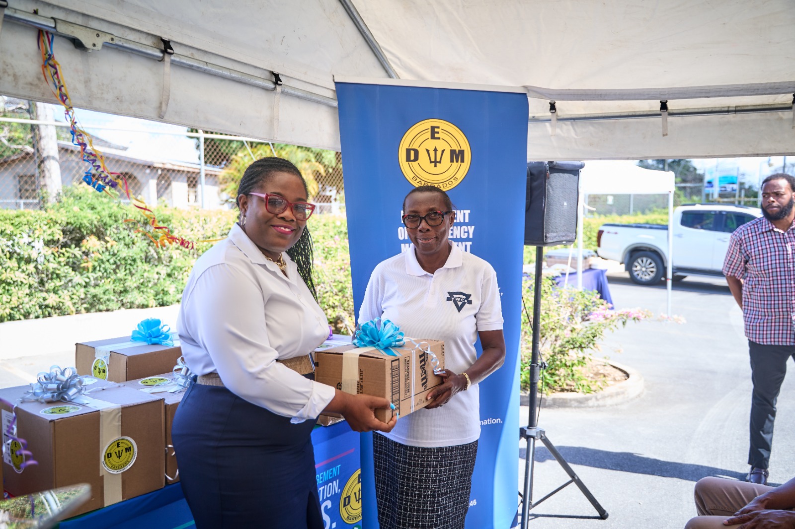 Kerry Hinds, Director Department Of Emergency Management, presenting a donation to representative from the Young Women Christian Association, Clypie Vaughan. (SB)